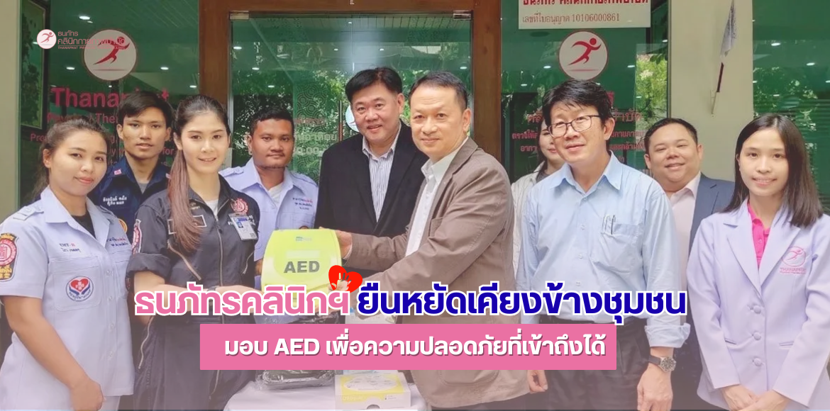 ธนภัทรคลินิกกายภาพบำบัด ลาดพร้าว 124 ได้ทำการมอบ เครื่องกระตุกหัวใจไฟฟ้าชนิดอัตโนมัติ (AED) เพื่อใช้ในการช่วยเหลือชีวิตผู้ป่วยกรณีฉุกเฉิน โดยมีวัตถุประสงค์เพื่อเพิ่มความปลอดภัยและสร้างความมั่นใจให้แก่ผู้มารับบริการ รวมถึงบุคลากรและคนในชุมชนใกล้เคียง